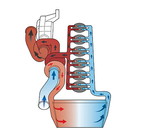 В турбомоторе воздух, который попадает в цилиндры, часто приходится дополнительно охлаждать — тогда его давление можно будет сделать выше, загнав в цилиндр больше кислорода. Ведь сжать холодный воздух (уже в цилиндре ДВС) легче, чем горячий.